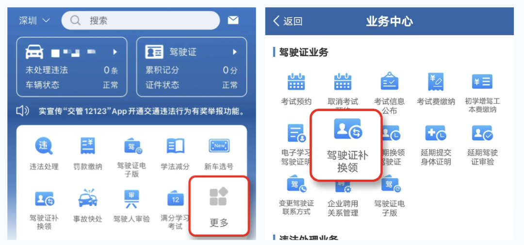 注册登录“交管12123”APP → 绑定驾驶证 → 更多业务 → 业务中心 → 驾驶证业务 → 驾驶证补换领。