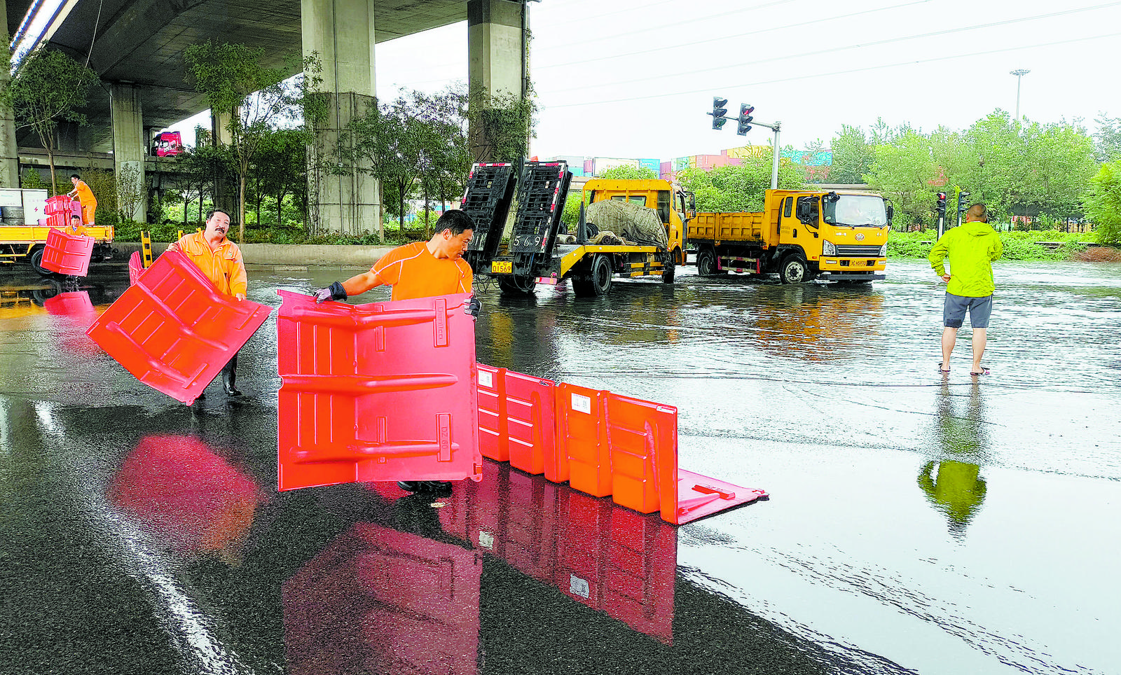 昨日,本市滨海新区出现强降雨,排管部门在积水路段设立挡板,防止车辆通行发生危险。本报记者 周伟摄